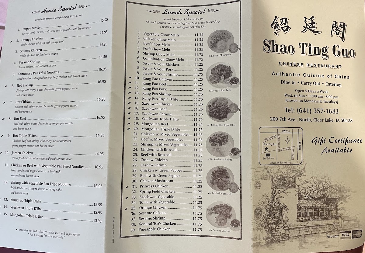 If you're in the mood for a delicious and unique dining experience, look no further than Shao Ting Guo Menu. Located at 200 7th Ave N in Clear Lake, IA, this spot offers an array of mouthwatering dishes that will satisfy any craving. From flavorful appetizers to hearty main courses, the menu features a diverse range of options that will leave you wanting more. Whether you're in the mood for a classic favorite or something with a twist, the carefully crafted dishes promise to deliver on taste and quality. Each bite is a testament to the restaurant’s commitment to using fresh ingredients and bold flavors. The relaxed and welcoming atmosphere makes it a perfect place to enjoy a meal with friends or family.